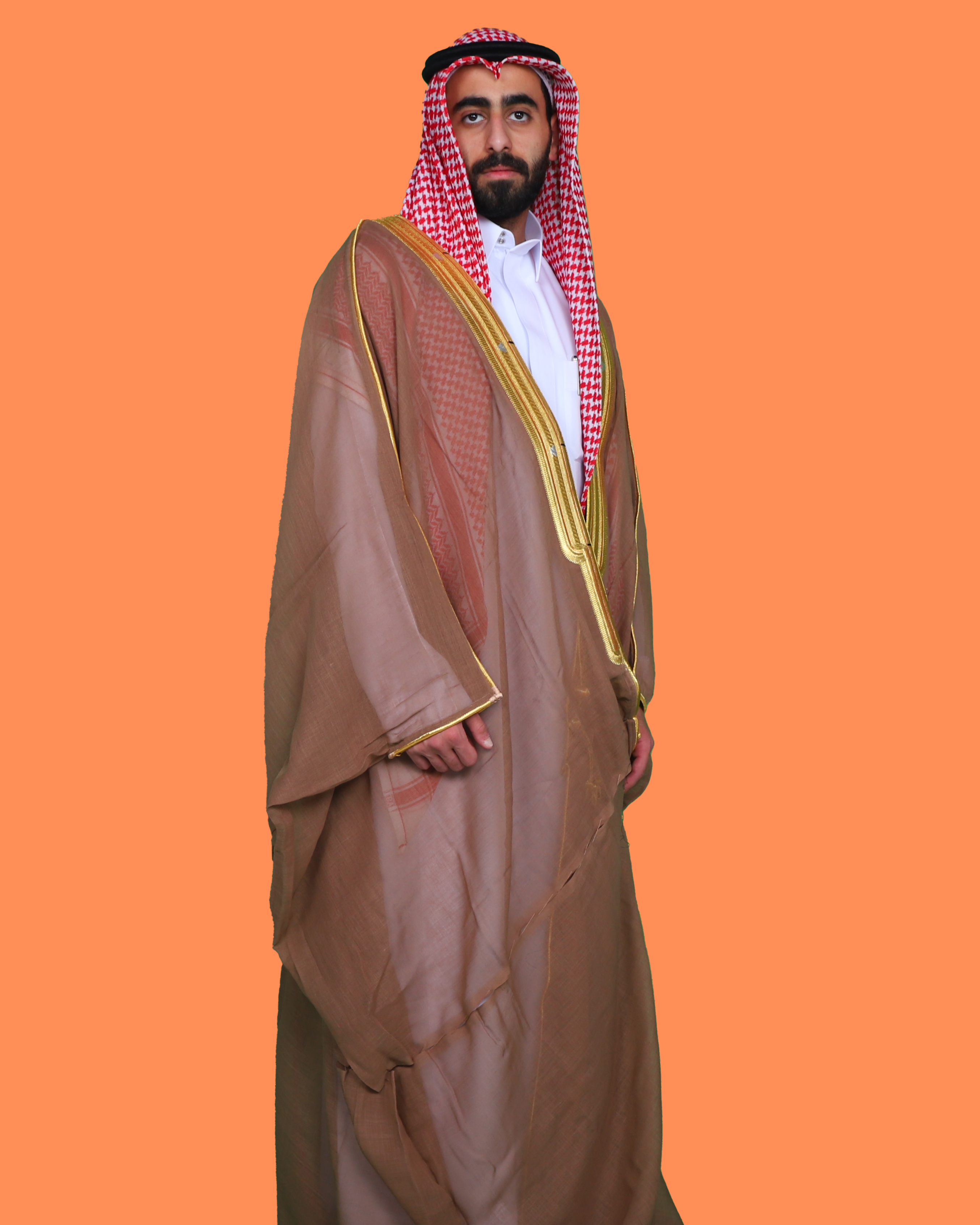 تميّز بإطلالة ملكية ناعمة مع بشت ملكي بلون لحمي من بشت وشال. تصميم يجمع بين الوقار والرقي، بلون هادئ أنيق يناسب المناسبات الرسمية والخاصة، مع تفاصيل محلية تبرز الجودة والأصالة.
