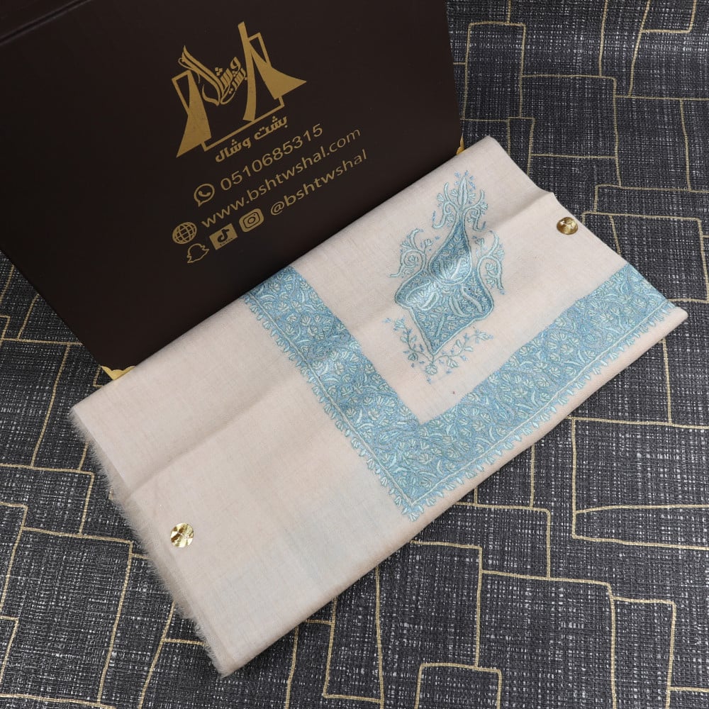 شال باشمينا مطرز ازرق فاتح بلونه البيج مع النقش الازرق فاتح الهادئ، يضفي لمسة من الأناقة الهادئة والفخامة اليومية. احصل عليه الآن من متجر بشت وشال بسعر خاص وحصري، واستمتع بالدفء والراحة طوال الشتاء.